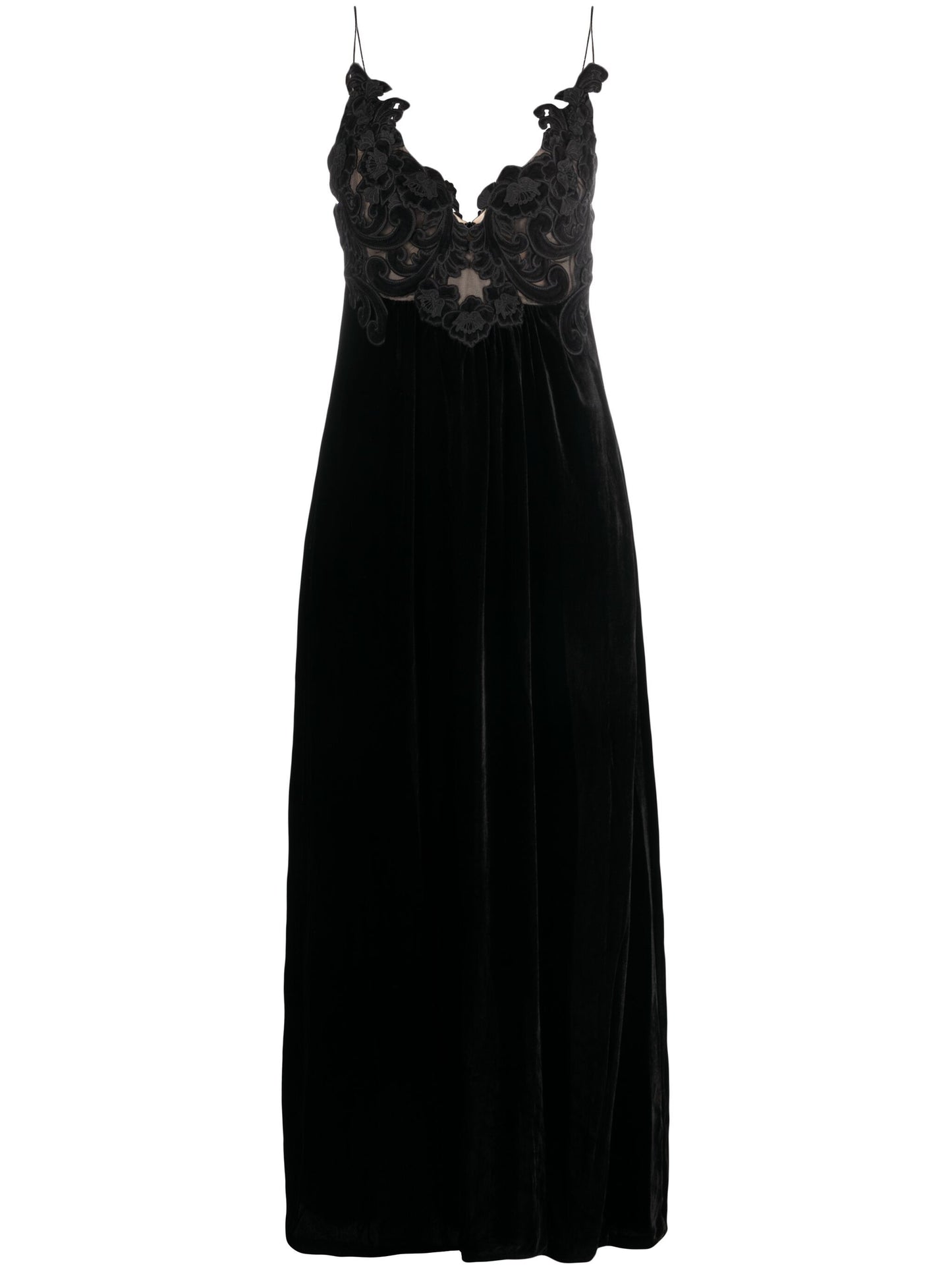 تتجلى جماليات زيمرمان الزخرفية في هذا الفستان ذو الخط A الذي يجمع بين تنورة مخملية مثيرة وزخارف زهرية معقدة.